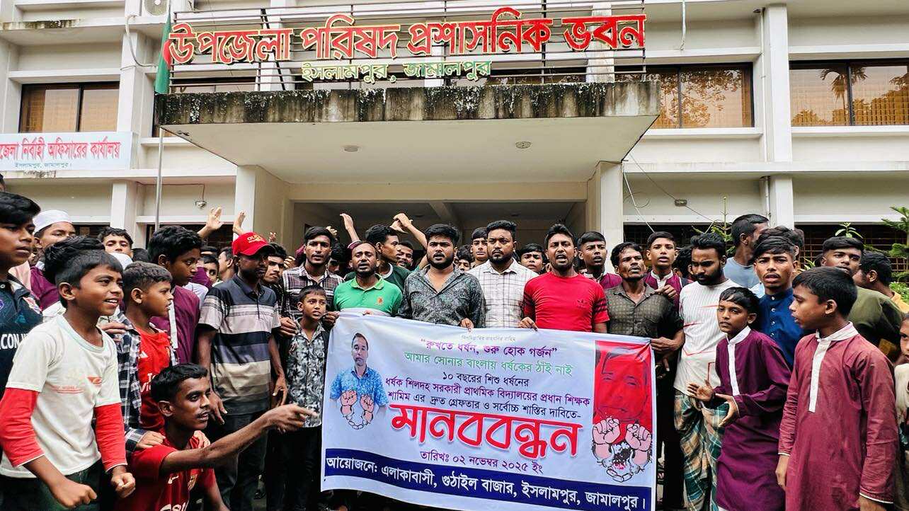 জামালপুরের ইসলামপুর উপজেলার গুঠাইল বাজারে ১০ বছরের এক শিশুকে ধর্ষণের অভিযোগে শিলদহ সরকারি প্রাথমিক বিদ্যালয়ের প্রধান শিক্ষক শামীমের দ্রুত গ্রেফতার ও সর্বোচ্চ শাস্তির দাবিতে মানববন্ধন অনুষ্ঠিত হয়েছে।