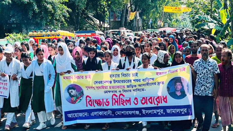 জামালপুরের দেওয়ানগঞ্জে শশুরবাড়িতে গৃহবধূ এতিম সুমাইয়ার রহস্যজনক মৃত্যুতে দ্রুত বিচার ও সুষ্ঠু তদন্তের দাবিতে ইসলামপুরে রাস্তা অবরোধ ও বিক্ষোভ মিছিল করে এলাকাবাসী ।