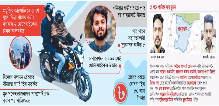 তদন্ত সংশ্লিষ্ট সূত্র বলছে, গত শনিবার গভীর রাতে ময়মনসিংহের সীমান্তঘেঁষা উপজেলা হালুয়াঘাটের একটি দুর্গম সীমান্ত পথ পাড়ি দিয়ে ভারতের মেঘালয়ে পালিয়ে যায় ফয়সাল ও আলমগীর। তাদের সীমান্ত পারাপারে সহায়তায় জড়িত দুই মানব পাচারকারীকেও (টাকার বিনিময়ে অবৈধভাবে সীমান্ত পারাপারে সহায়তাকারী, যারা দালাল নামে পরিচিত) আটক করেছে ঢাকা মহানগর পুলিশ (ডিএমপি)। এর আগে গত শুক্রবার দুপুরে রাজধানীর পল্টনের বক্স কালভার্ট রোডে মোটরসাইকেলে আসা দুই আততায়ীর একজন রিকশায় থাকা হাদিকে গুলি করে। পরদিন পুলিশের পক্ষ থেকে গুলি ছোড়া ফয়সালের ছবি প্রকাশ করে পুরস্কার ঘোষণা করা হয়। ফয়সাল করে গুলি, আর মোটরসাইকেলটি চালাচ্ছিল আলমগীর। গতকাল রোববার পুলিশ সেই মোটরসাইকেল উদ্ধারের কথা জানিয়েছে। হাদি আসন্ন জাতীয় সংসদ নির্বাচনে ঢাকা-৮ আসনের সম্ভাব্য স্বতন্ত্র প্রার্থী। সংকটাপন্ন অবস্থায় গতকাল পর্যন্ত রাজধানীর একটি বেসরকারি হাসপাতালে তার চিকিৎসা চলেছে। তবে আজ সোমবার দুপুরে একটি এয়ার অ্যাম্বুলেন্সে সিঙ্গাপুরে নেওয়ার কথা রয়েছে মাথায় গুলি লাগা হাদিকে। প্রধান উপদেষ্টার প্রেস উইং থেকে গতকাল রাতে এ তথ্য জানানো হয়। প্রেস উইং জানিয়েছে, প্রধান উপদেষ্টা অধ্যাপক মুহাম্মদ ইউনূসের নির্দেশে গতকাল সংস্কৃতি উপদেষ্টা মোস্তফা সরয়ার ফারুকী, প্রধান উপদেষ্টার স্বাস্থ্য মন্ত্রণালয়বিষয়ক বিশেষ সহকারী অধ্যাপক ডা. মো. সায়েদুর রহমান, এভারকেয়ার হাসপাতালের বিশেষজ্ঞ চিকিৎসক ডা. জাফর ও ওসমান হাদির ভাই ওমর বিন হাদির মধ্যে এক জরুরি টেলিফোন কনফারেন্সে এ বিষয়ে সিদ্ধান্ত হয়।